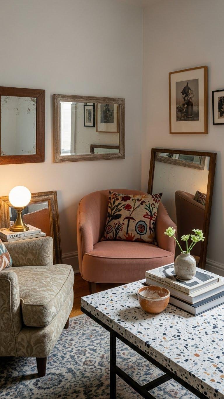 Let the intimate curves of your reading nook meet the bold lines of a modern table so the space feels collected, not staged. Mix a curved vintage armchair and thrifted mirrors with clean terrazzo tables to balance history and now.