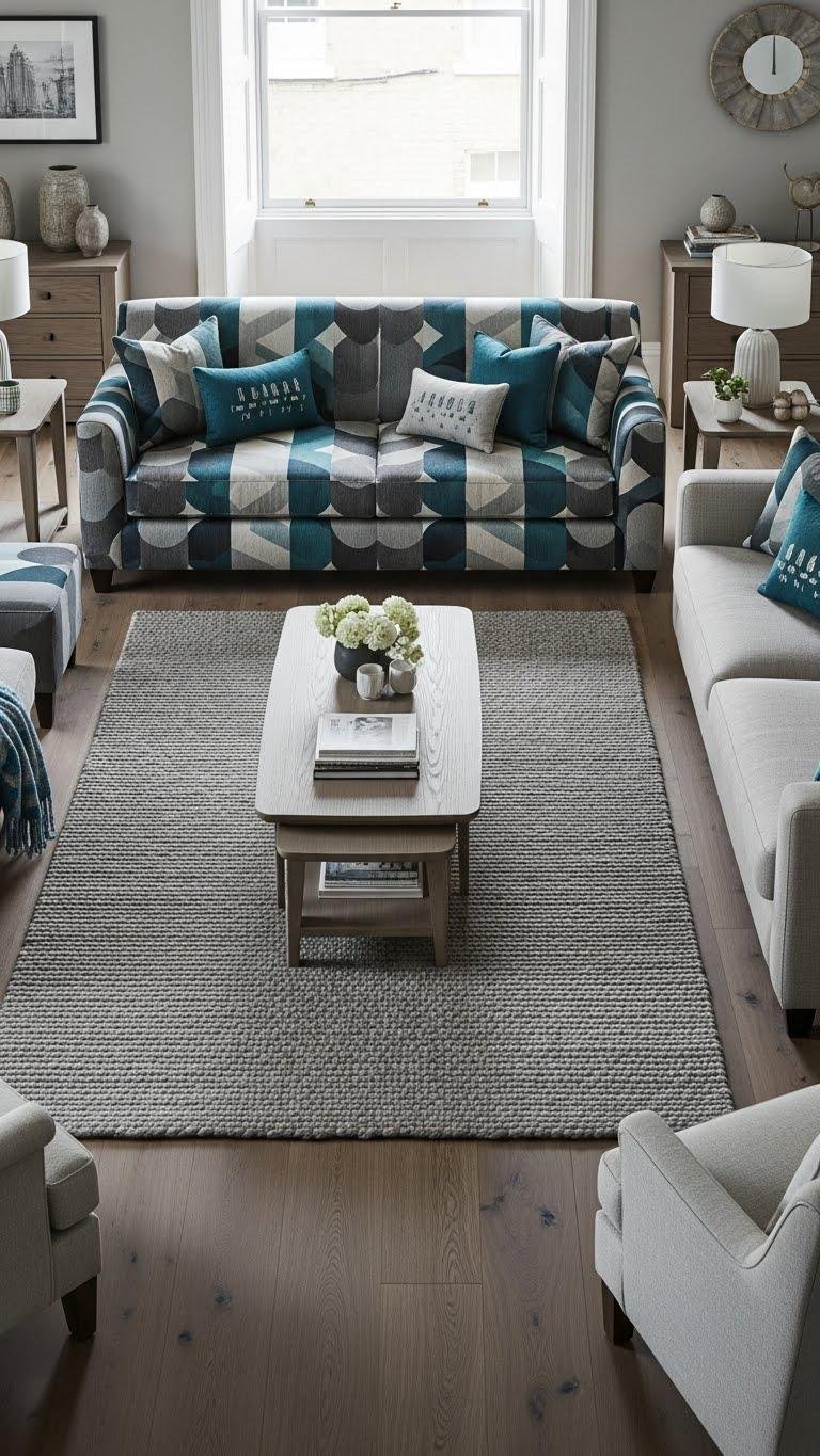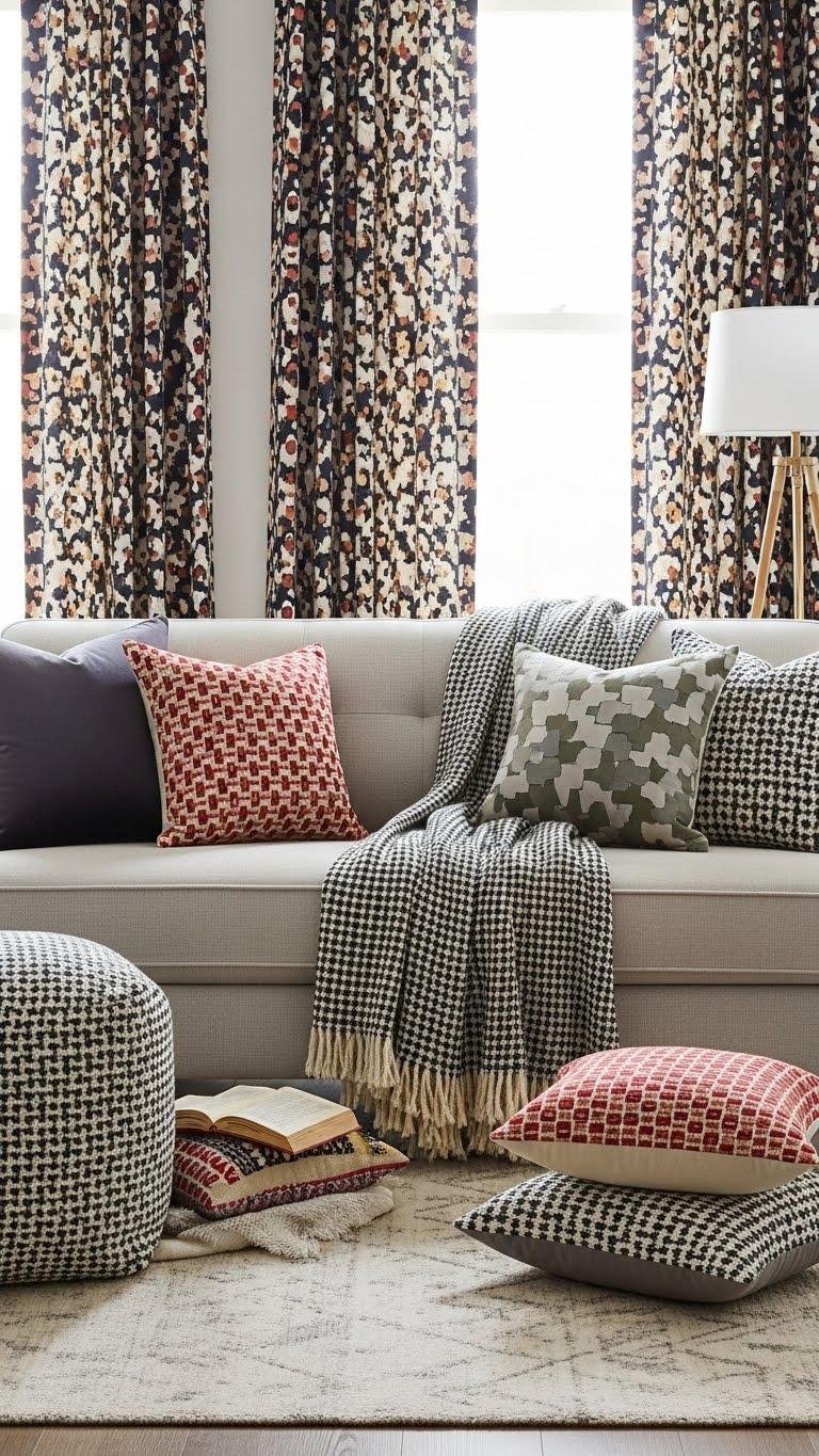 You’ll create intentional upholstery contrast without chaos — layer pillows, pick one dominant motif, and let uncluttered neutrals hold the space so you can move freely.