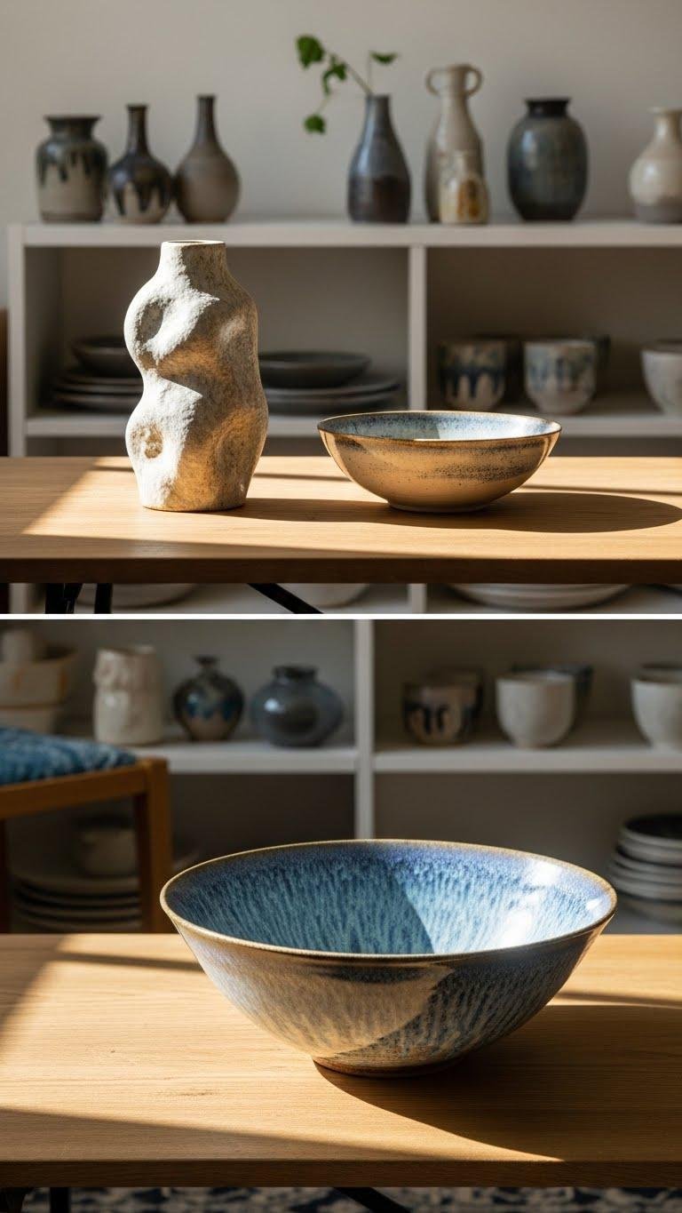 Bring out handcrafted ceramics and artisanal objects to give your space soul and texture: place a sculpted vase or a hand-thrown bowl where light can catch its glaze, cluster small pieces on open shelving at varied heights, and use a larger ceramic as an anchor on a coffee table or mantel.