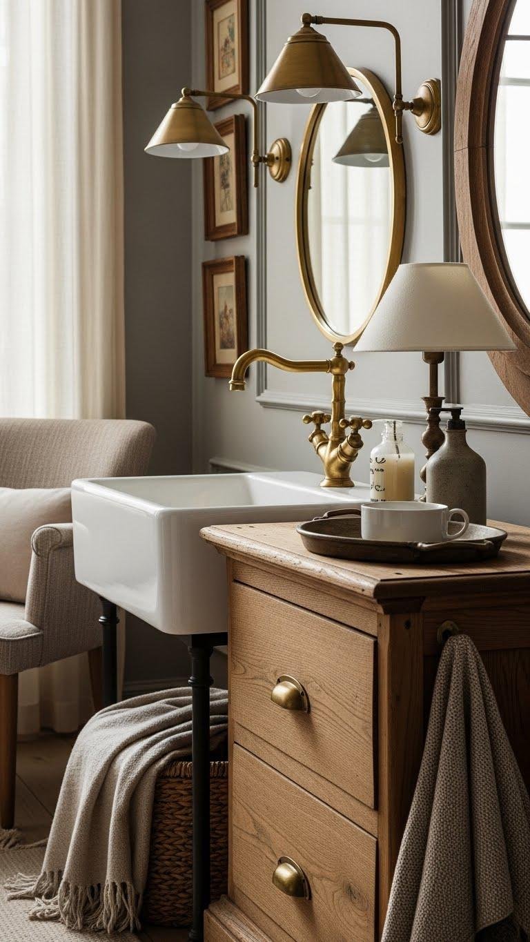 You’ll mix aged brass hardware with soft textiles, leather, and warm woods to create contrast that feels effortless. Choose patinated brass fixtures for faucets, lamps, and drawer pulls to add depth, character, and a sense of relaxed, curated freedom.