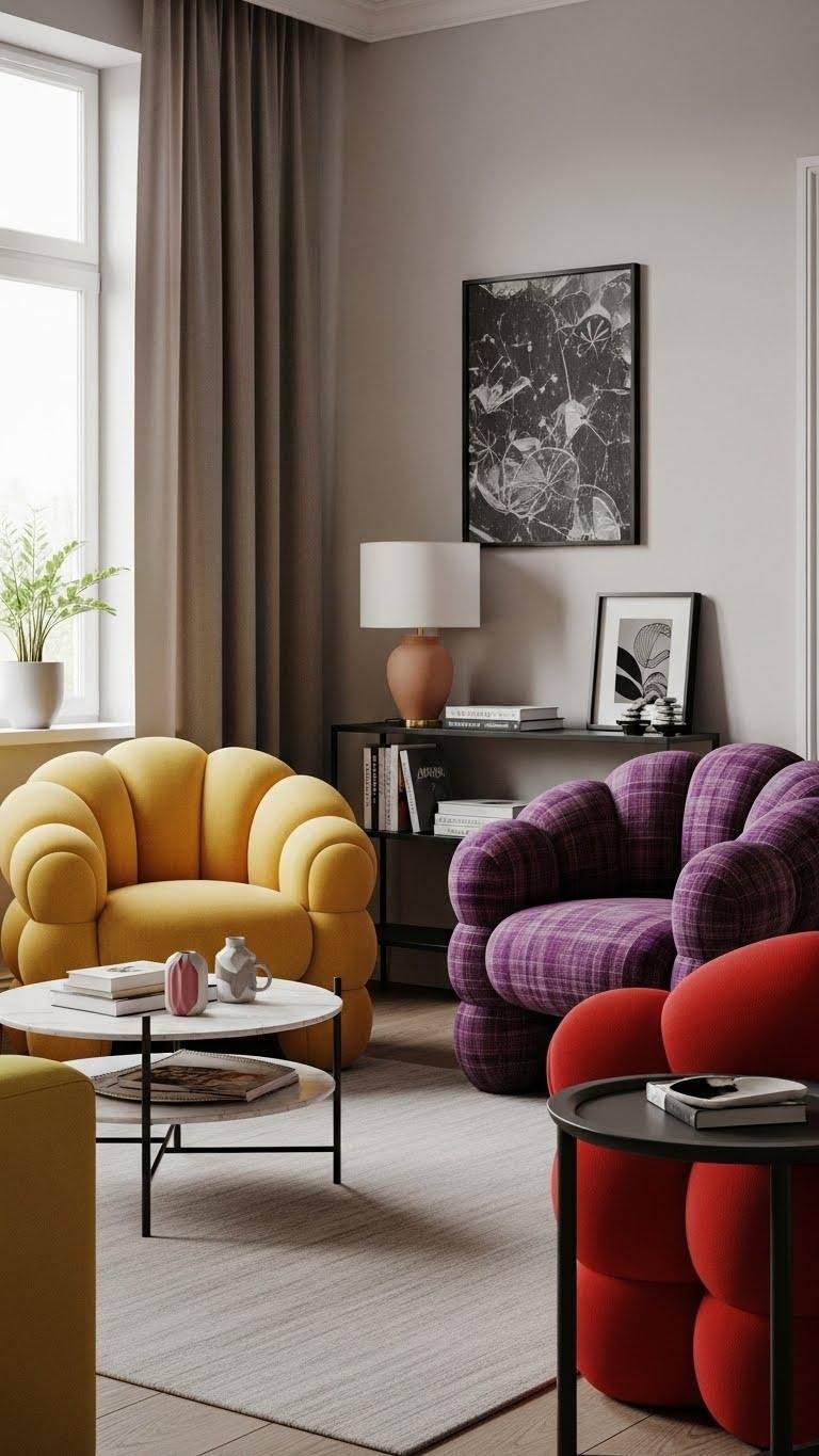You’ll pick pieces with bubble silhouettes and bold upholstery to anchor a corner, balancing playful proportions with streamlined surroundings.