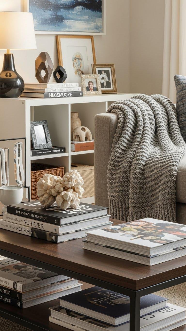 Layer books, throws, and personal memorabilia to make your space feel curated rather than cluttered: stack a few artful titles on a coffee table, drape a chunky knit over an arm for instant texture, and tuck small mementos into open shelving to tell a quiet story.