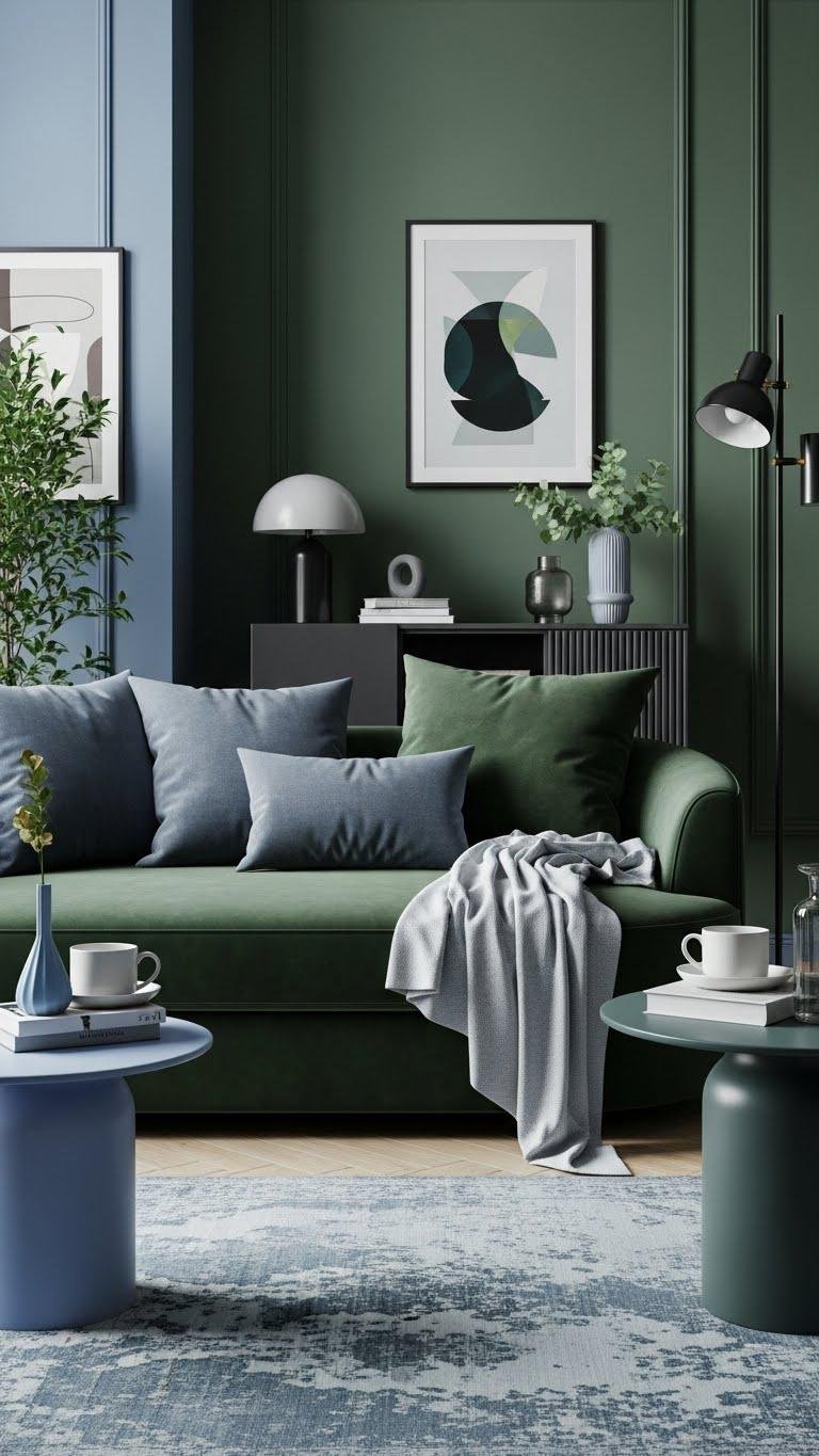 Curved shapes invite a softer palette, so try anchoring them with deep greens and balancing that weight with dusty blue accents. You’ll layer deep forest upholstery on a rounded sofa, then add slate cerulean pillows and a lightweight throw to lift the mood.