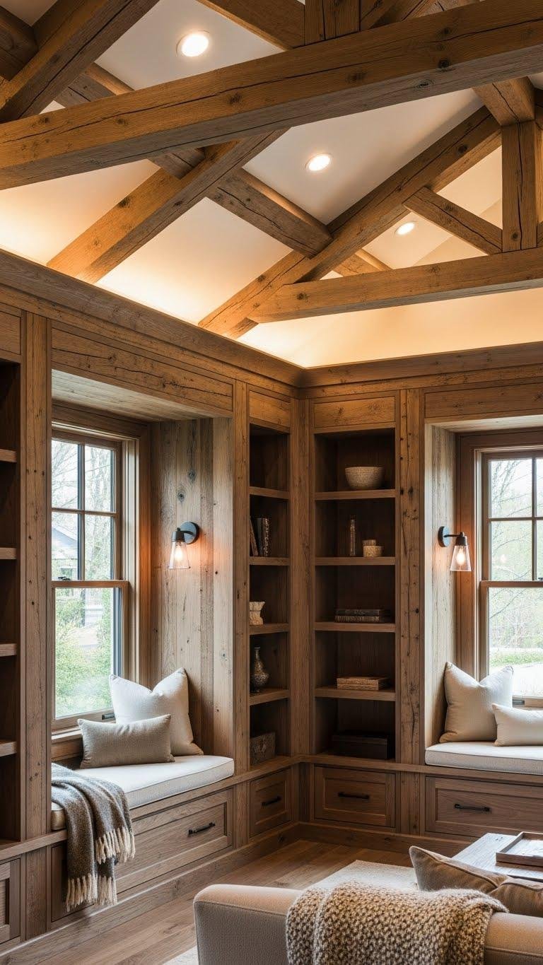 Introduce rich wood millwork and ceiling beams to anchor a cozy chic room—think walnut or aged oak that adds warmth and sculptural weight without feeling heavy. Use reclaimed timber for trim, window seats, and built-ins to tell a story. Leave exposed rafters where possible to create rhythm and openness. Keep finishes matte, joints clean, and let the wood’s grain guide your layout and lighting choices.