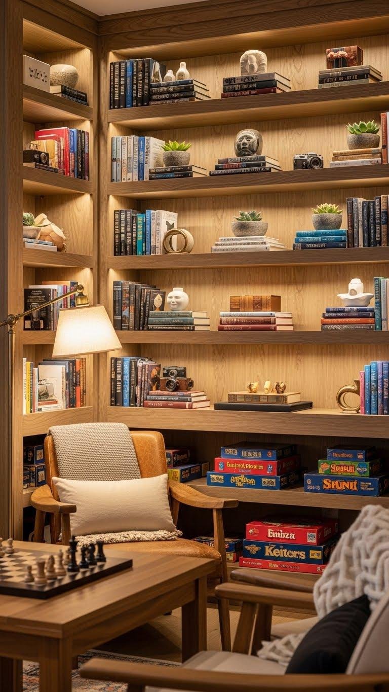 A built-in bookshelf nook turns an empty corner into an intimate refuge where your books, trinkets, and a well-placed lamp become a curated backdrop for quiet moments.