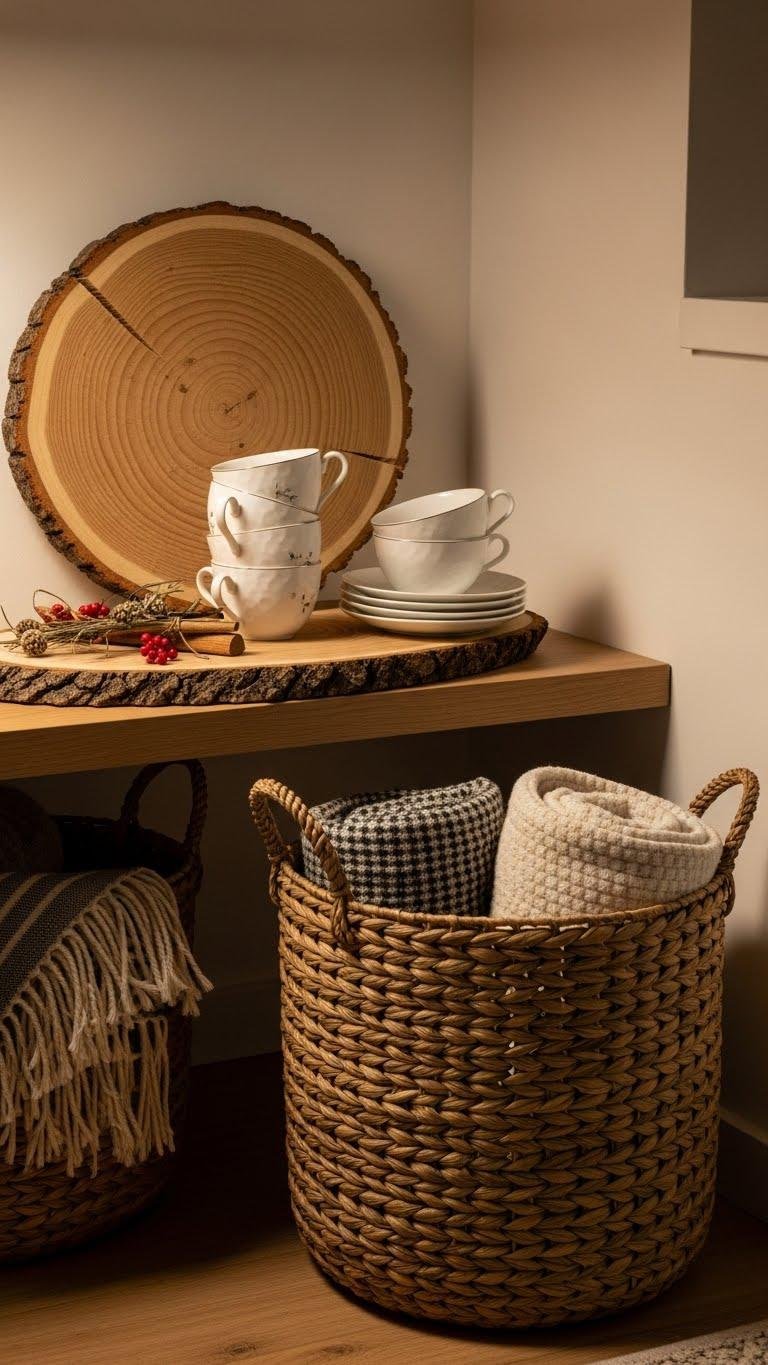From the mirror-lit calm, shift your attention to textures that feel grounded: warm woods and woven baskets. You’ll arrange a low shelf with a seasonal woodcut slab, stack teacups, and tuck throws into a rustic basketlight glow.