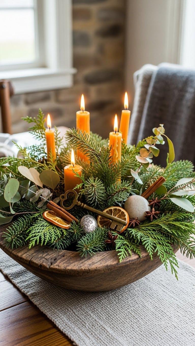 You’ll tuck an antique doughbowl into a sunlit nook, craft a simple DIY centerpiece with pine, cinnamon sticks, and brass accents, and breathe easy.