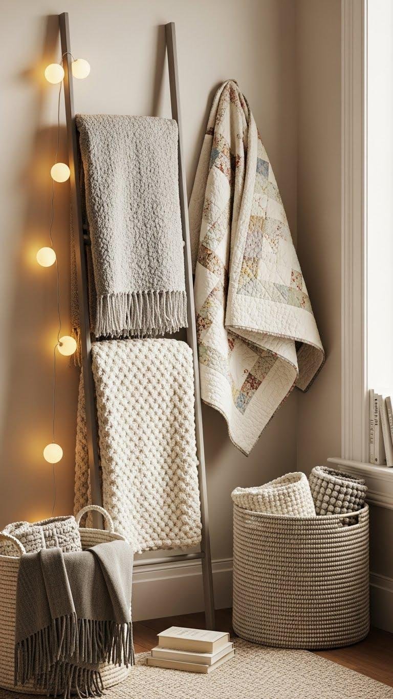 Lean a slim ladder against the wall and let its rungs hold a rotation of soft throws—woolen, cashmere, and a chunky knit that invites you to touch. You drape an heirloom quilt casually, pull a textured basket nearby for extras, and carve a reading nook that smells of pages. Ambient lighting washes the corner; you sink in, free and unfussy.