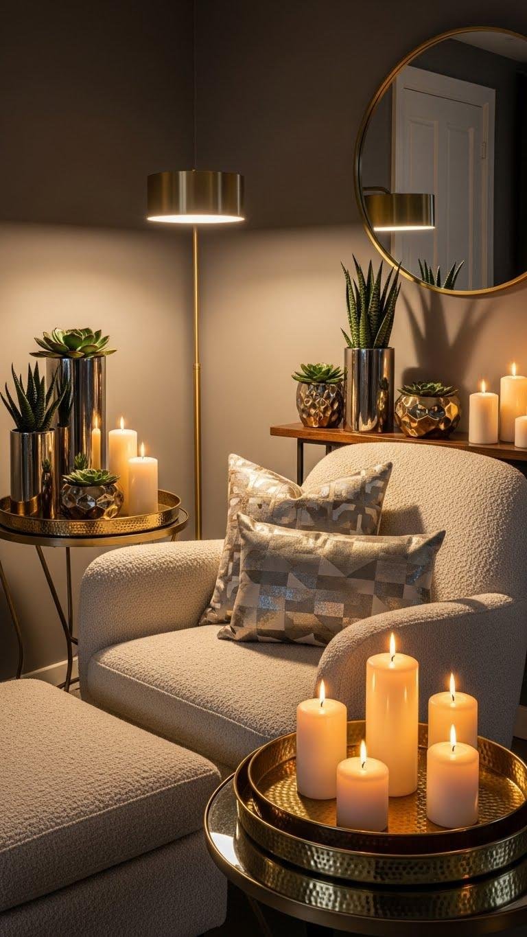 Slip up from the soft nook to a corner that sparkles: metallic accents catch the candlelight and lift the room’s hush. You’ll place metallic planters with sculptural succulents, mix mirrored surfaces and hammered trays for tactile contrast, and drape a brass floor lamp for warm reflections. The effect feels liberated—clean, luminous, and quietly adventurous, inviting you to linger and breathe.