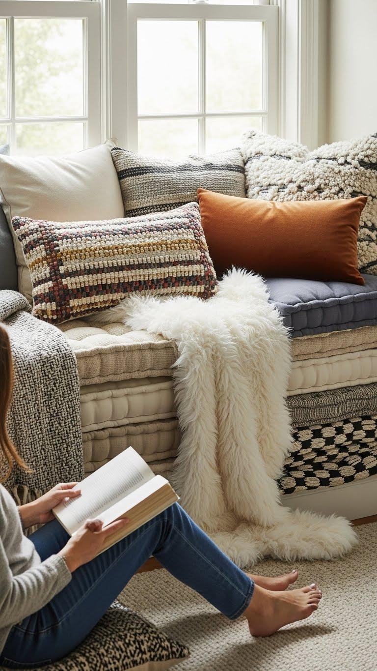 Tuck yourself into a window seat dressed in layered textiles that invite touch and lingering—plush cushions, a downy throw, and a mix of woven and velvet pillows that catch the light and soften the view.