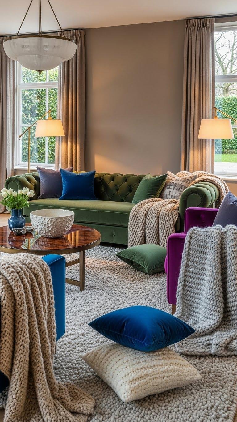 Start by layering velvet and mohair to create a tactile, high-impact foundation for a cozy-luxury interior. You’ll pair velvet tufting on anchor pieces with loose mohair sheens in throws and cushions, balancing structured depth and luminous movement. Choose muted jewel tones and soft neutrals, let texture define zones, and keep layouts open so you feel liberated, refined, and deliberately comfortable.