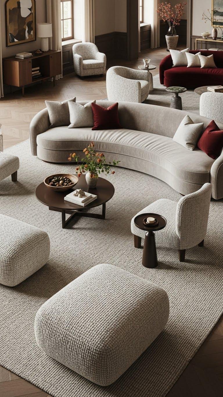 After you’ve layered plush velvets and airy mohair to build tactile richness, introduce curved sofas and organic seating to soften the room’s geometry and invite lingering conversations.