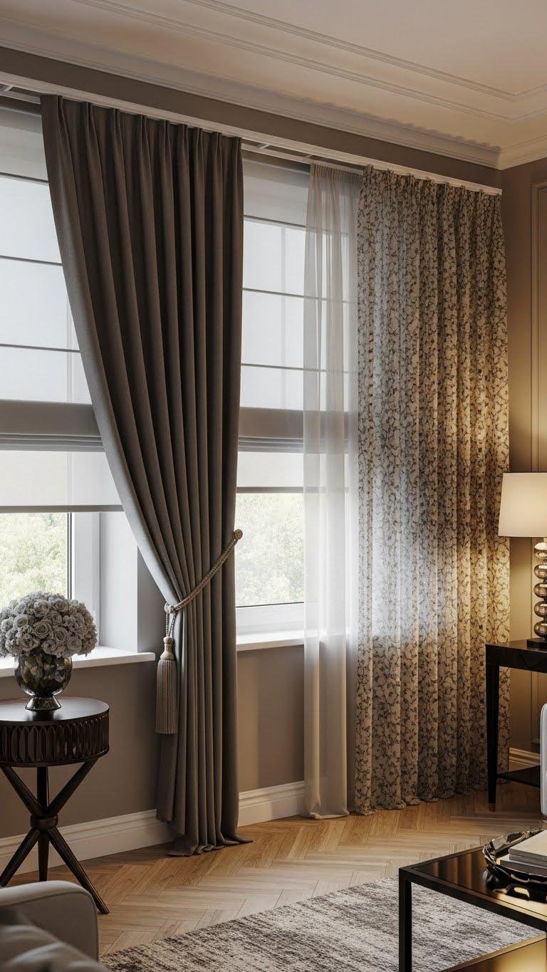 While smart lighting sculpts the room by day and night, layered window treatments give you physical depth and tactile control over that light.