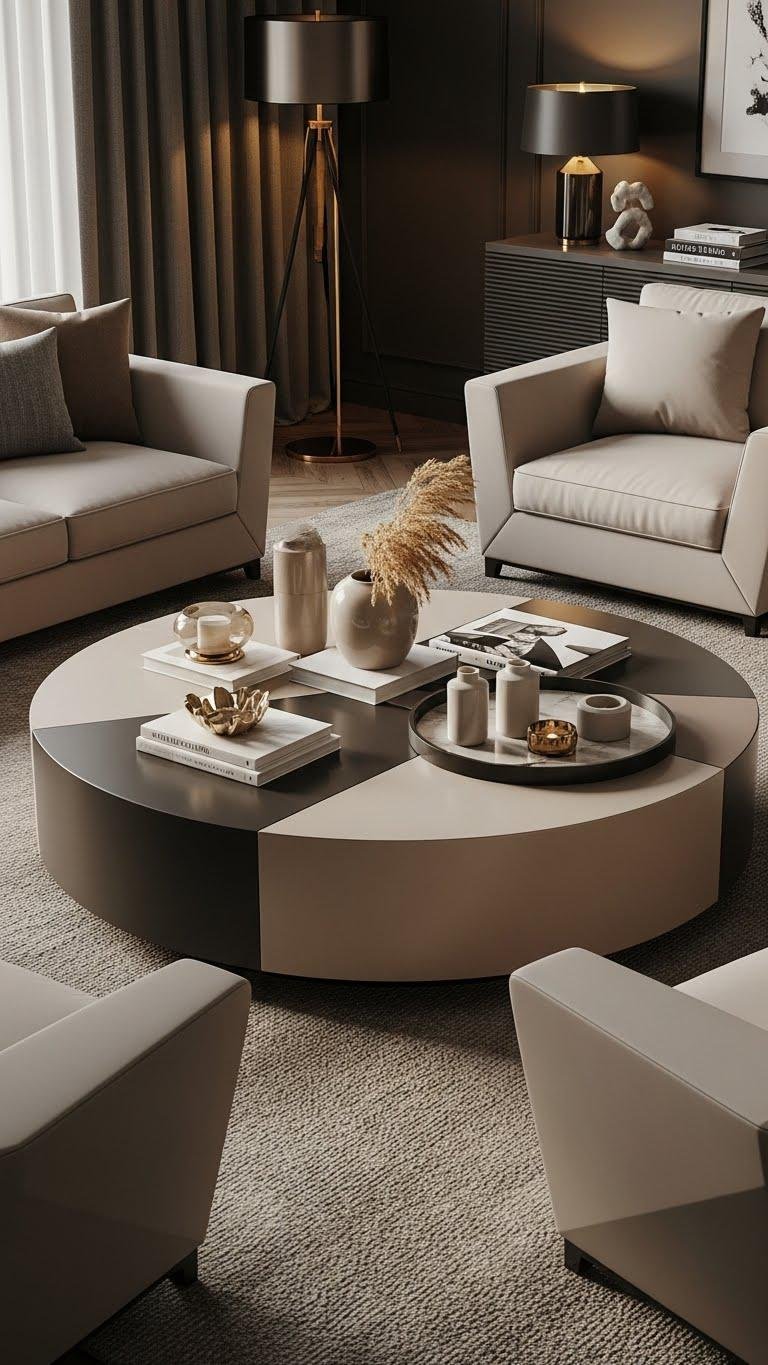 A circular coffee table anchors a seating area with effortless drama, inviting you to gather around its gentle curve while softening angular furniture.