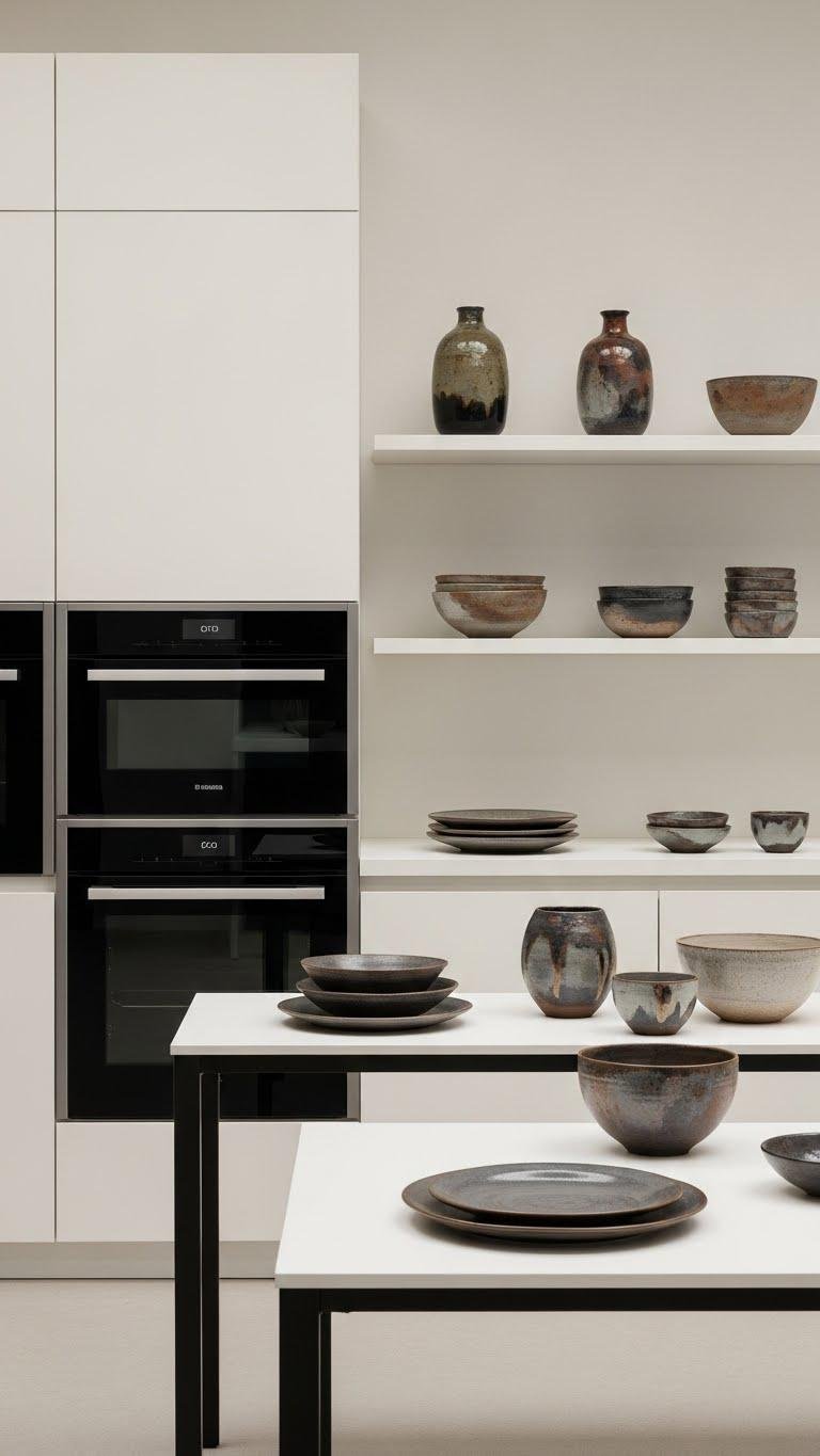 Integrated appliances keep surfaces clean and calm, and handcrafted ceramic and glass objects bring the human touch that completes that composed aesthetic. You’ll curate pieces like handmade raku bowls and mouthblown vases to punctuate shelves and tabletops, choosing texture and scale that invite touch without clutter. Select limited palettes, rotate displays seasonally, and let each object feel intentional and liberating.