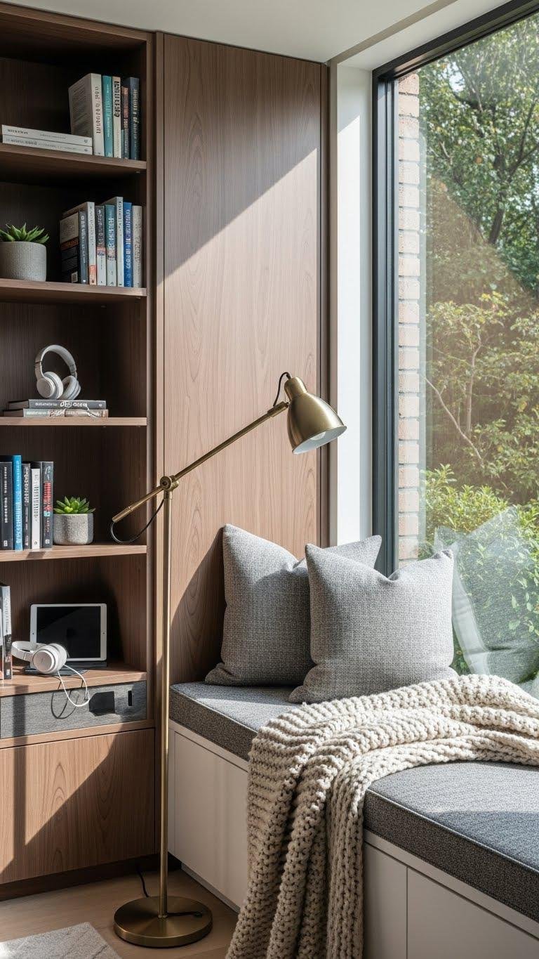 Tuck a reading nook into unused corners or beneath windows and pair it with built-in storage that keeps books, throws, and tech out of sight but within reach. You’ll craft sunlit alcoves with a streamlined seat, soft cushions, and discreet stacked cabinetry for curated possessions.