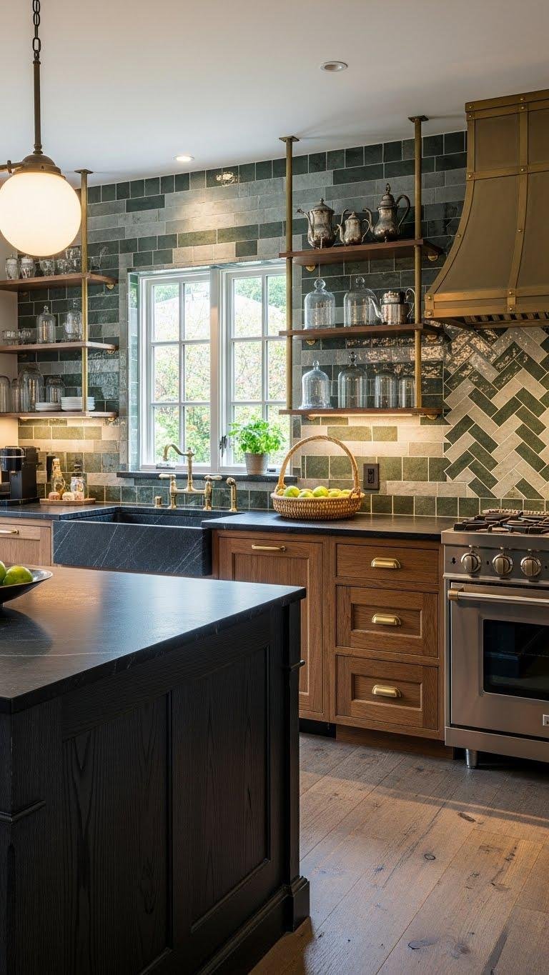 You’ll mix satin metals and matte stone countertops, add woven baskets and glass accents, select antique hardware for character, and use tile backsplashes with contrasting grout to emphasize pattern—cultivating a liberated, refined space that feels effortlessly curated.