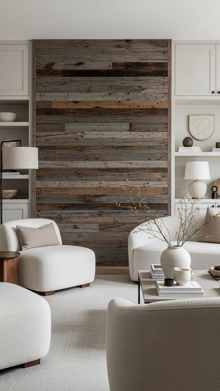 A reclaimed wood accent wall brings instant warmth and story to a room, grounding plush fabrics and curved seating with authentic texture and patina.
