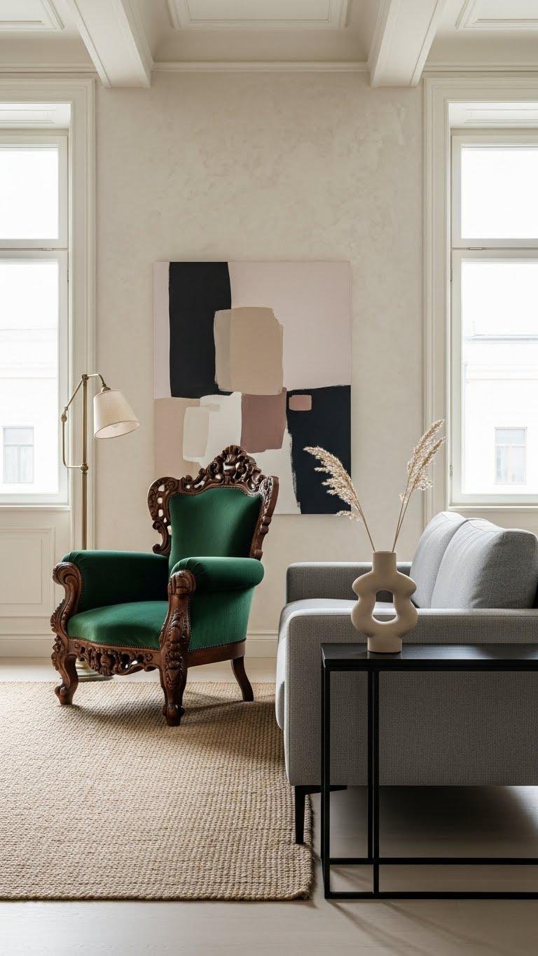 You’ll balance vintage modern finds with minimalist lines, embracing curated contrasts that free your style. Choose one statement antique, echo its tone in fabrics, and let clean geometry and restrained palettes keep the look polished, personal, and effortlessly luxurious.
