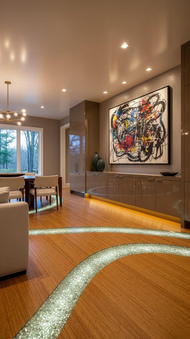 Framing a room with bamboo and recycled glass flooring accents lets you introduce texture and conscience without sacrificing polish. You’ll pair bamboo mosaics with subtle grain to warm open spaces, while recycled glass inlays add light-catching detail and eco-forward luxury.