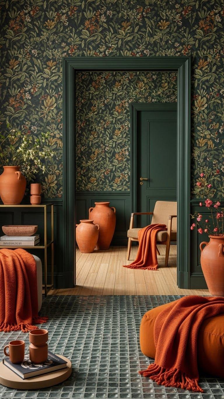 You’ll balance botanical wallpaper with terracotta pottery, plush throws, and matte brass accents to create a liberated, refined room.