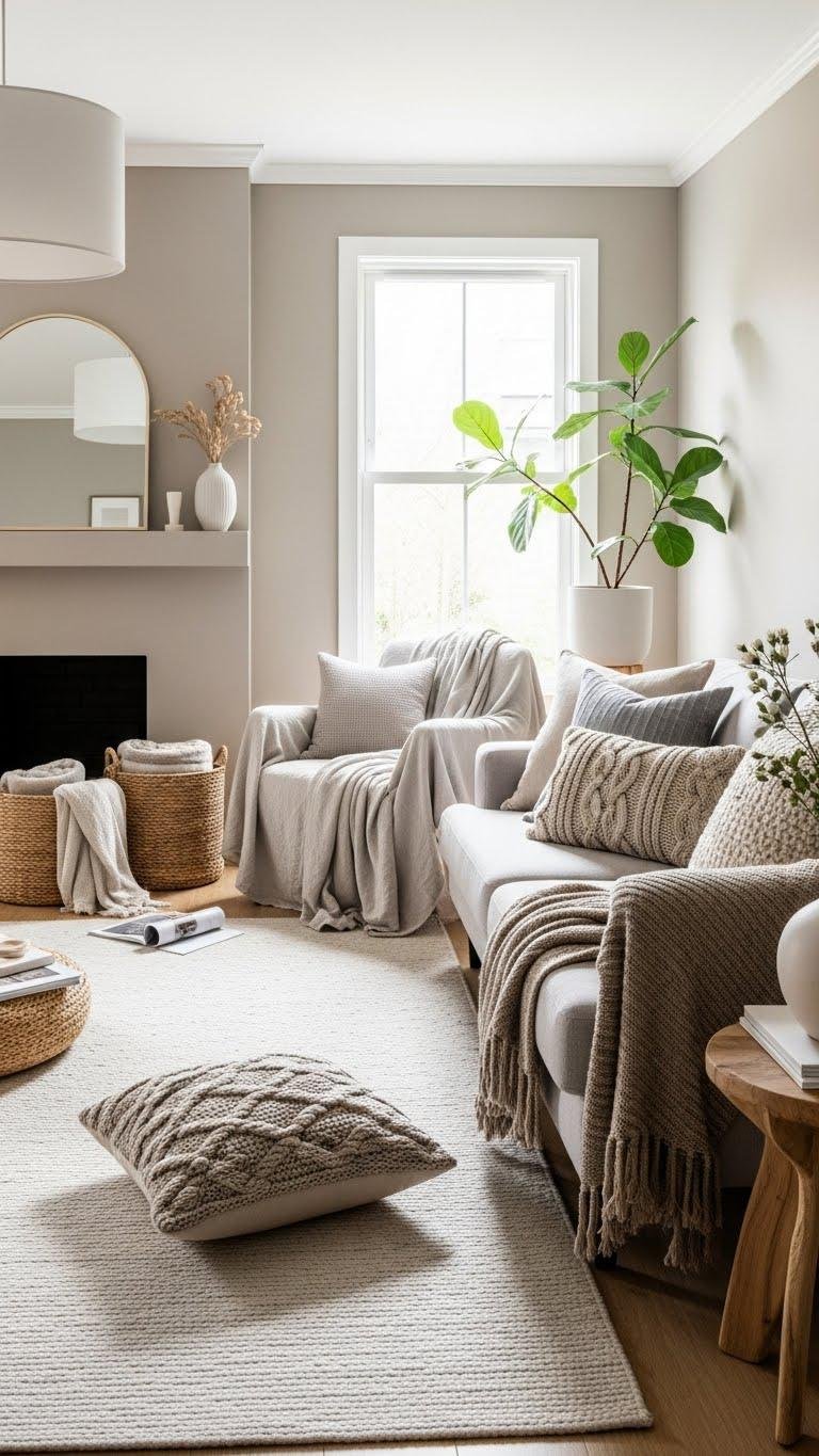 Drape linen throws over chairs, mix textured pillows, and add a lightweight wool rug for depth.