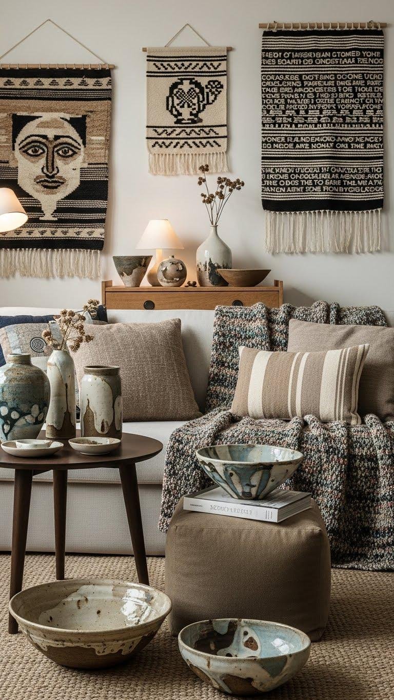 Bring in handcrafted and repurposed accent pieces to give your neutral scheme personality and quiet soul. Choose handmade ceramics for imperfect bowls and vases that feel lived-in, and layer upcycled textiles as throws, cushions, or wall hangings to tell stories.