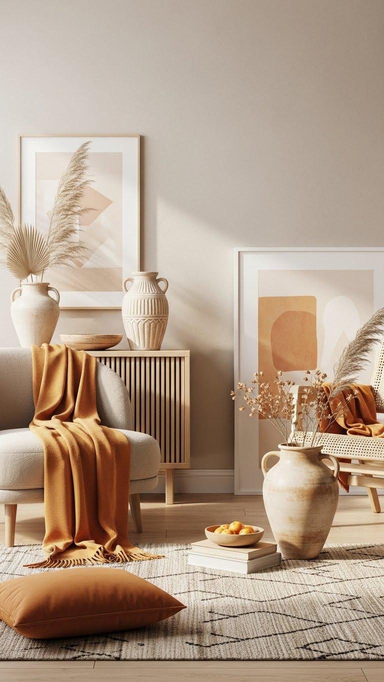 Since neutrals create a tranquil base, introducing ochre and warm beige gives the room a grounded, sunlit warmth without overwhelming the calm.