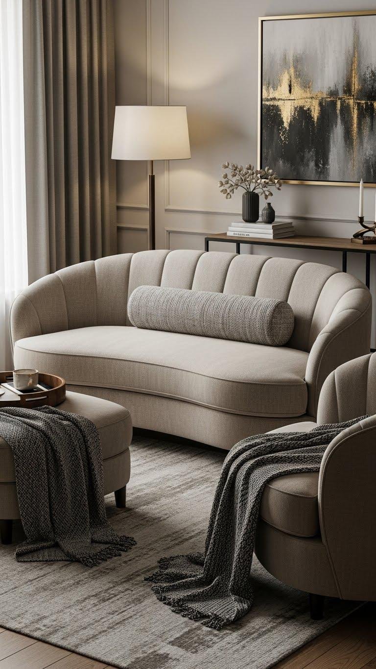 Choose a curved sofa to softly define your living area and invite conversation; its rounded silhouette breaks up straight lines, creates flow, and makes the room feel cozy without crowding it.