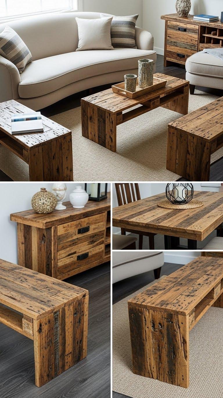 After you’ve let a curved sofa soften the room’s lines, bring in reclaimed wood pieces to add depth and warmth.