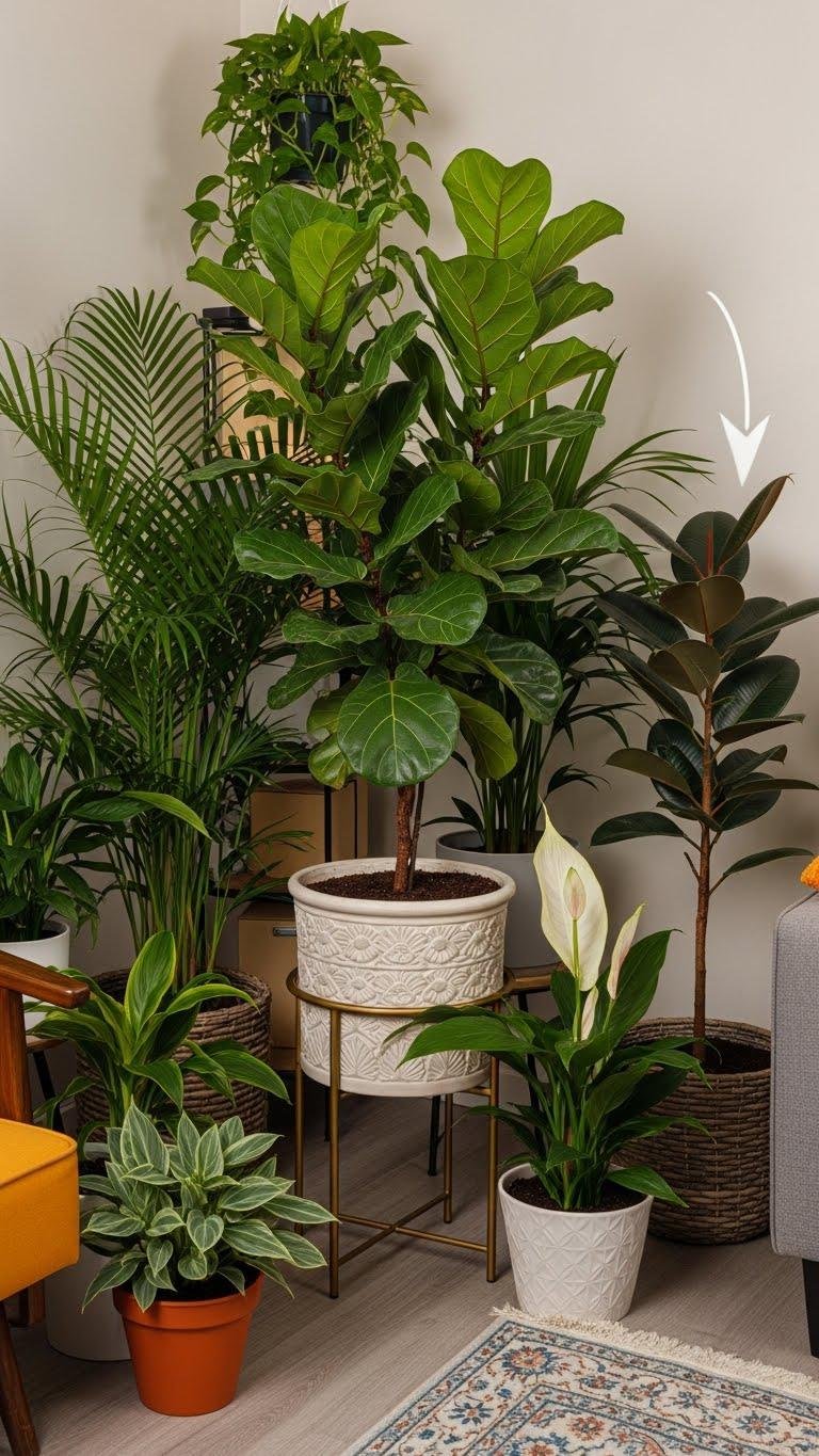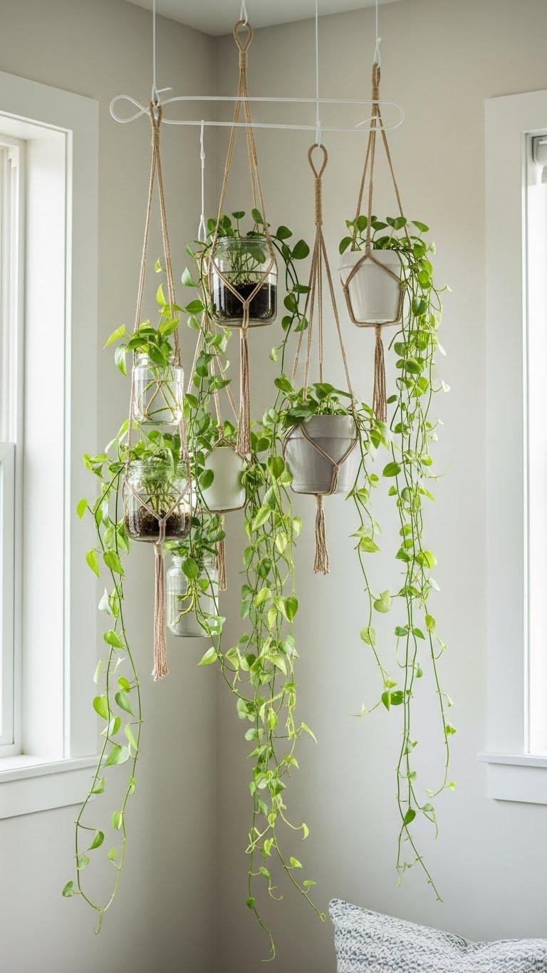 For a fresh, living focal point, tuck a cluster of hanging planters into a quiet corner and let trailing vines soften the lines of the room. You’ll mix hanging propagation jars and lightweight pots, stagger heights, and train stems along a minimalist vine trellis.