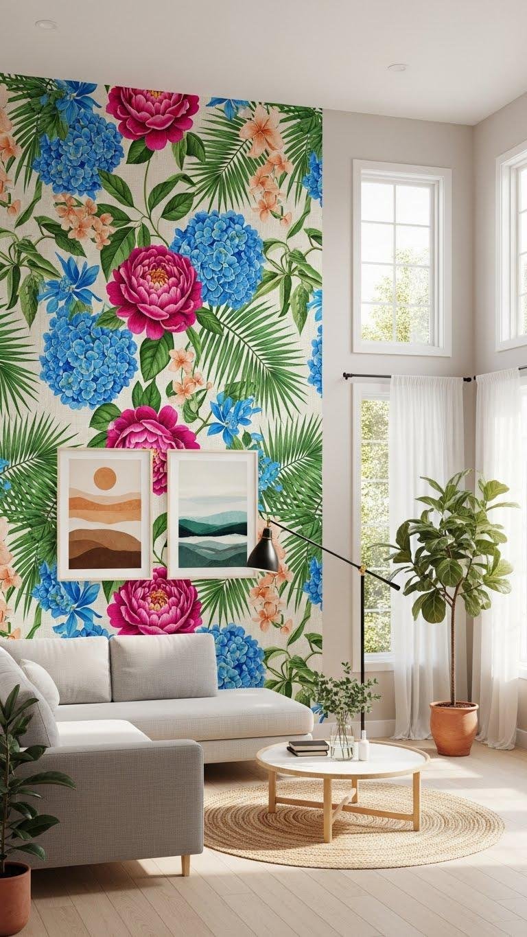 Make one wall your statement by hanging bold botanical wallpaper that brings lush scale and color into the room without cluttering it. You’ll pick a print with vibrant scale and contrast, then apply it with breathable, textured paste for easy removal. Let that single mural anchor seating, art, and light—freeing the rest of the space to feel airy, intentional, and revitalizingly modern.
