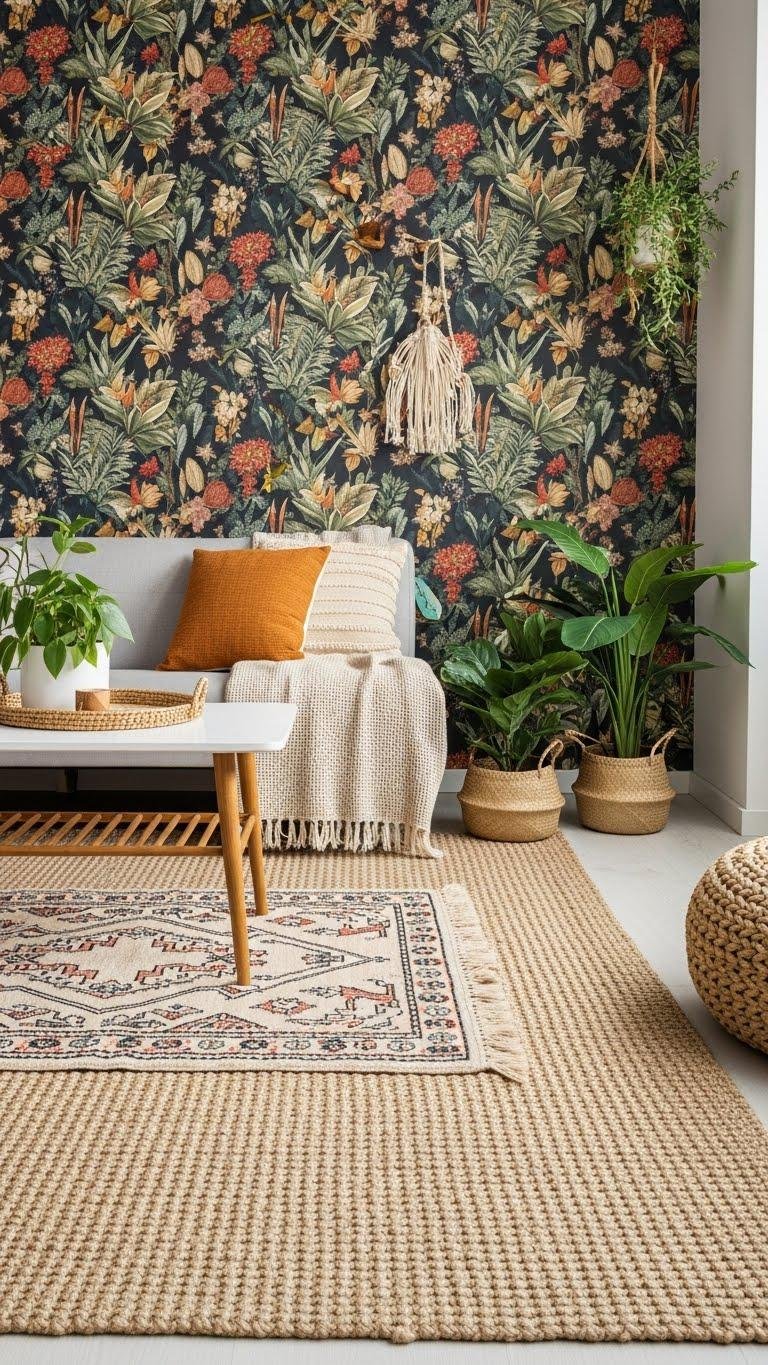 A single jute rug can instantly ground your seating area, adding warm texture and an organic anchor that balances bold botanical wallpaper without competing with it.