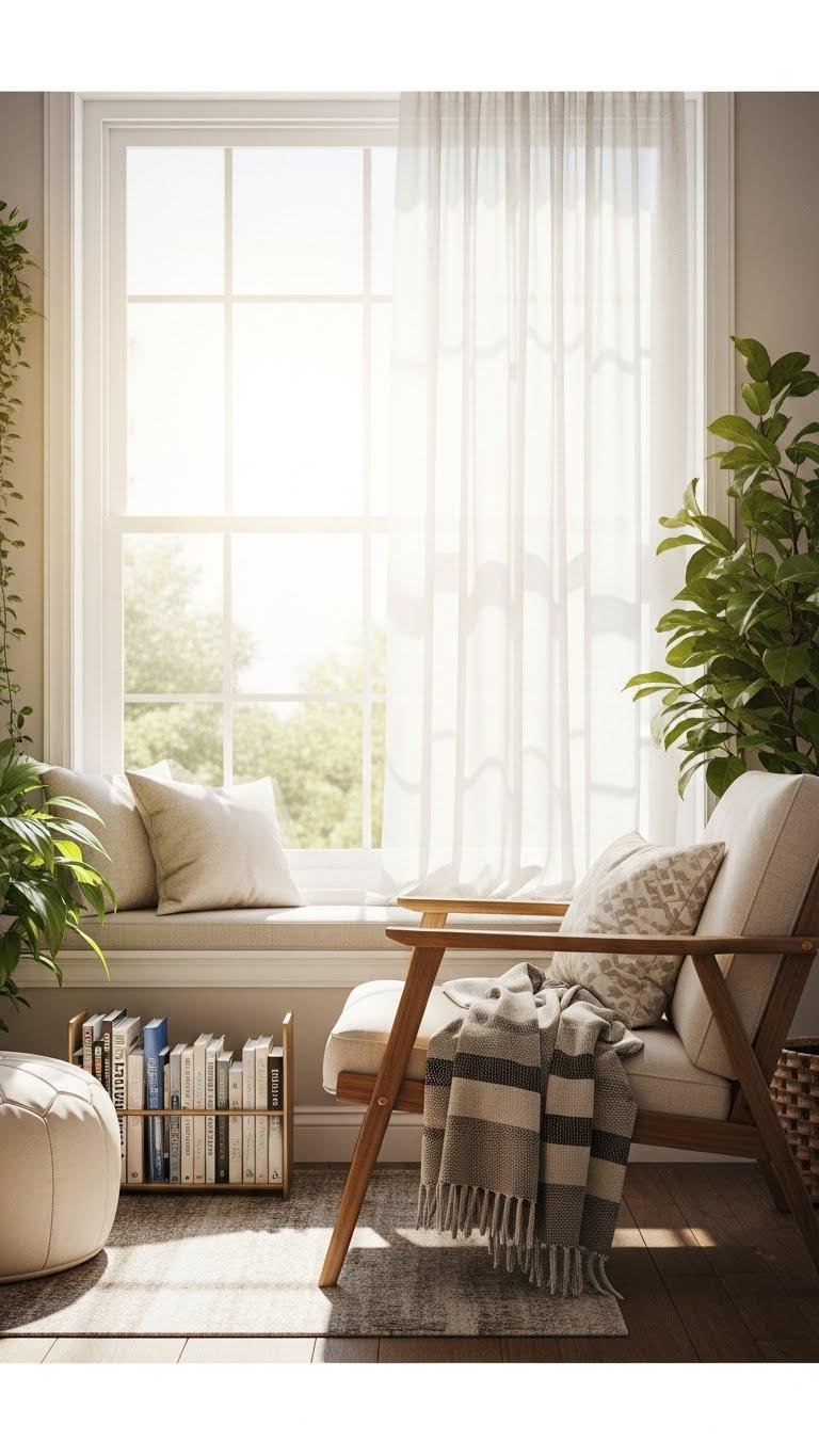 Add a compact window seat or pouf, a slim book caddy, layered throw, and a plant to keep the nook airy, free, and inviting.