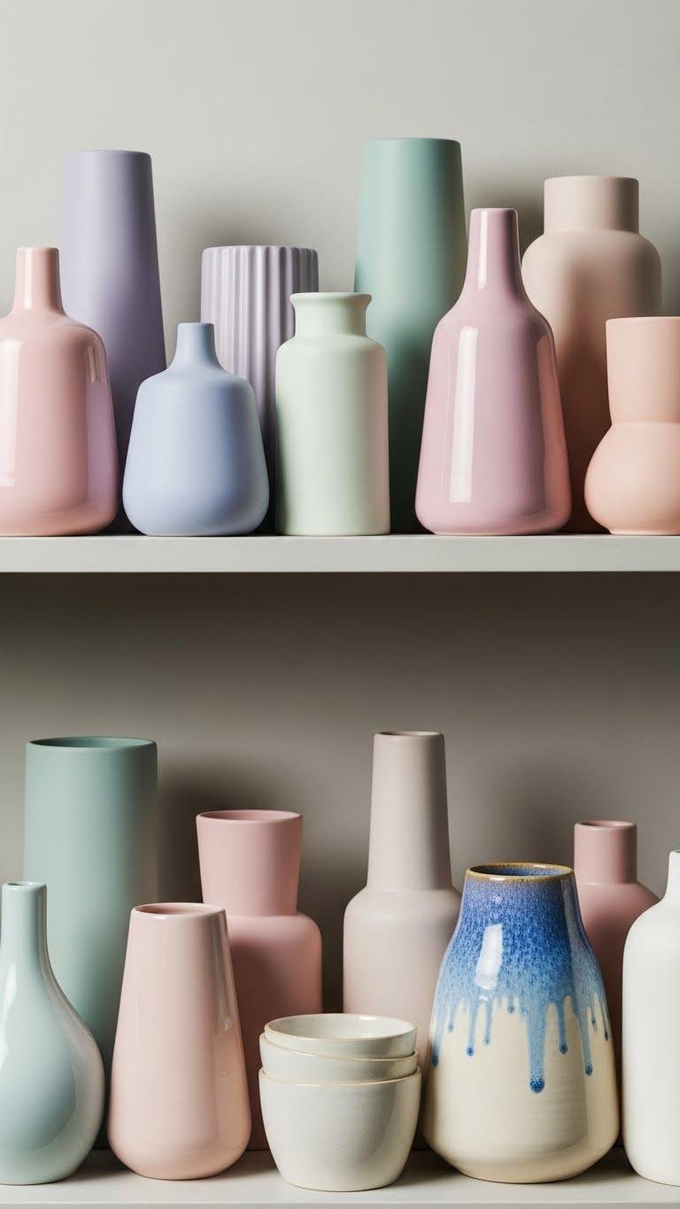 Balance matters—arrange pastel vases and ceramics with intentional spacing and varied heights so each piece reads as part of a cohesive display. You’ll play with color blocking by grouping soft hues against neutral backdrops, mixing matte finishes and pieces with vintage glaze for character. Let negative space breathe, rotate items seasonally, and keep arrangements loose yet deliberate so your shelves feel fresh and free.