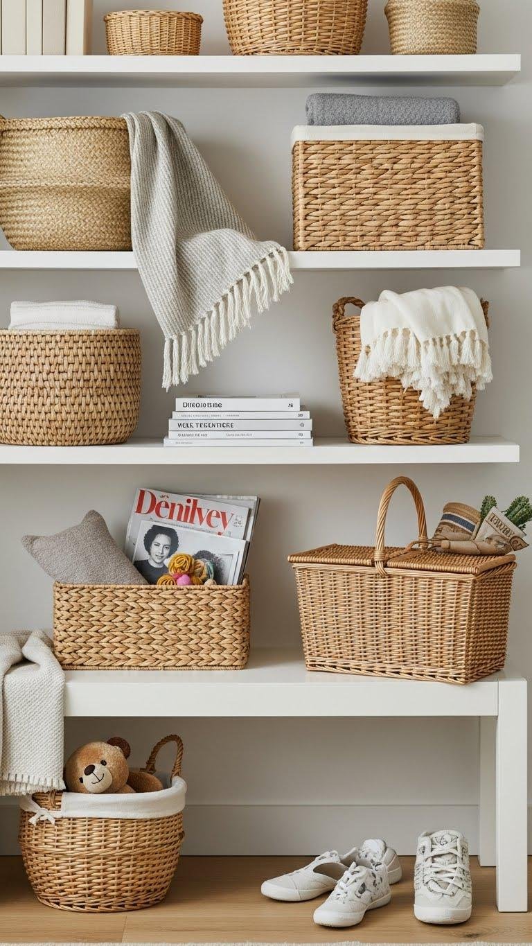 Tuck woven baskets into open shelving and corners to add texture and tidy overflow—think throws, magazines, toys, or extra linens. You’ll choose storage baskets in natural tones, mixing sizes and shapes for effortless rhythm.