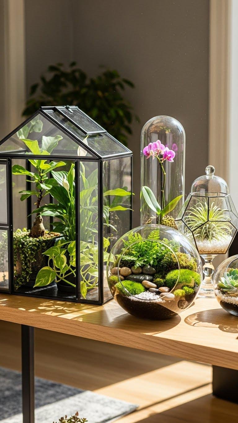 You’ll love a mini greenhouse on a sunny shelf—clean lines, easy care, instant life. A moss terrarium adds soft texture and low-maintenance calm. Group a few glass pieces, vary heights, and let free-flowing light make the display feel effortlessly alive.