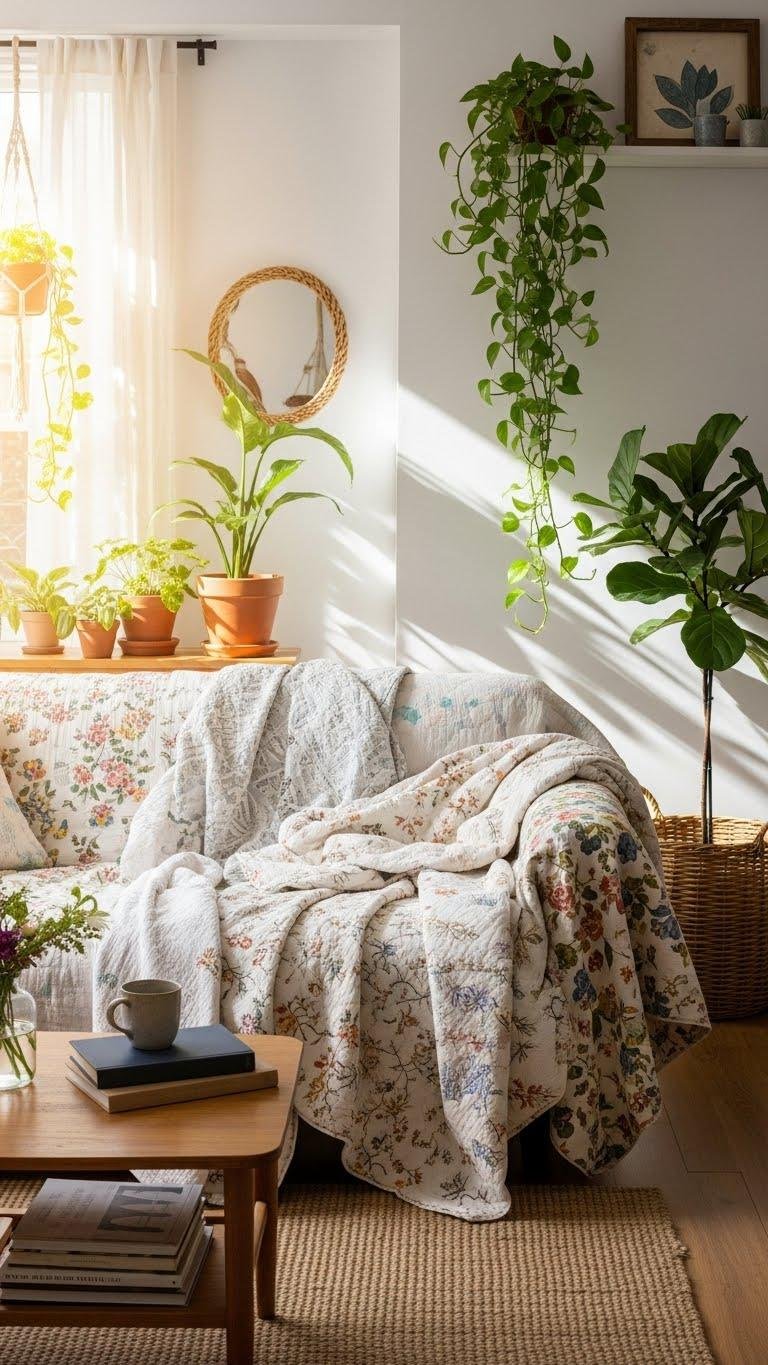Bringing greenery into a room sets a fresh tone—now layer in cozy textiles to finish the look. You’ll drape hand stitched quilts over sofas, mixing lightweight gauze with breathable cotton. Add throws patterned with vintage florals to punctuate color and roam freely with mismatched textures. Keep palettes airy, let sunlight highlight stitches, and embrace relaxed, wearable decor that invites lounging and movement.