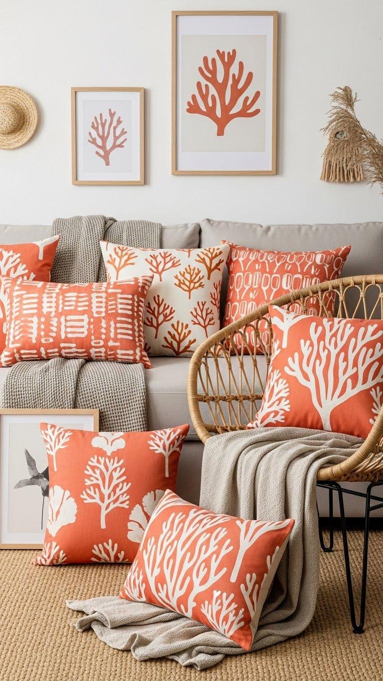 Introduce block-print cushions in warm corals to instantly lift a neutral sofa or wicker chair—these hand-printed patterns add tactile charm and a sunlit color pop without overwhelming the room.