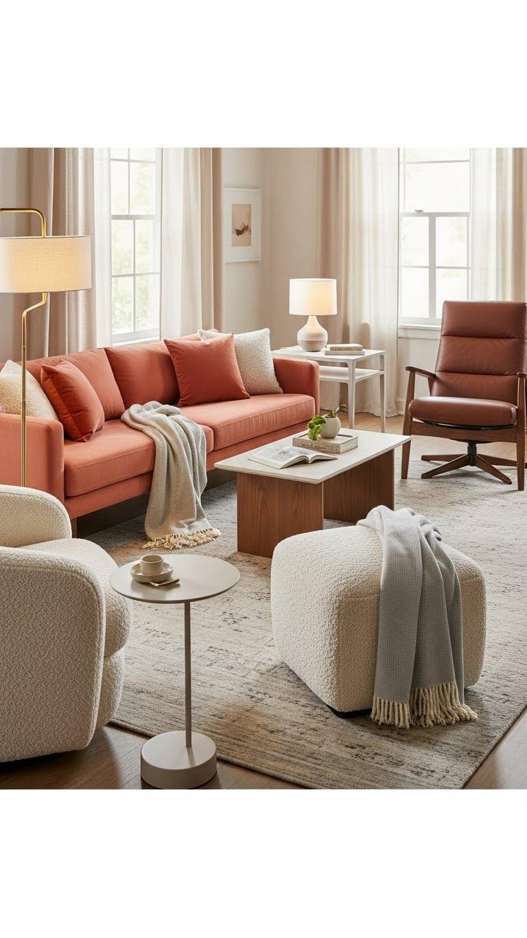 After the coral cushions lift the sofa, add a bouclé or walnut accent chair to anchor the seating area and boost comfort. Choose a boucle armchair with a matching bouclé ottoman for tactile warmth, or a sleek walnut recliner that reads modern and free. Pair with minimal side tables, light throws, and airy layout so you can lounge, move, and breathe effortlessly.