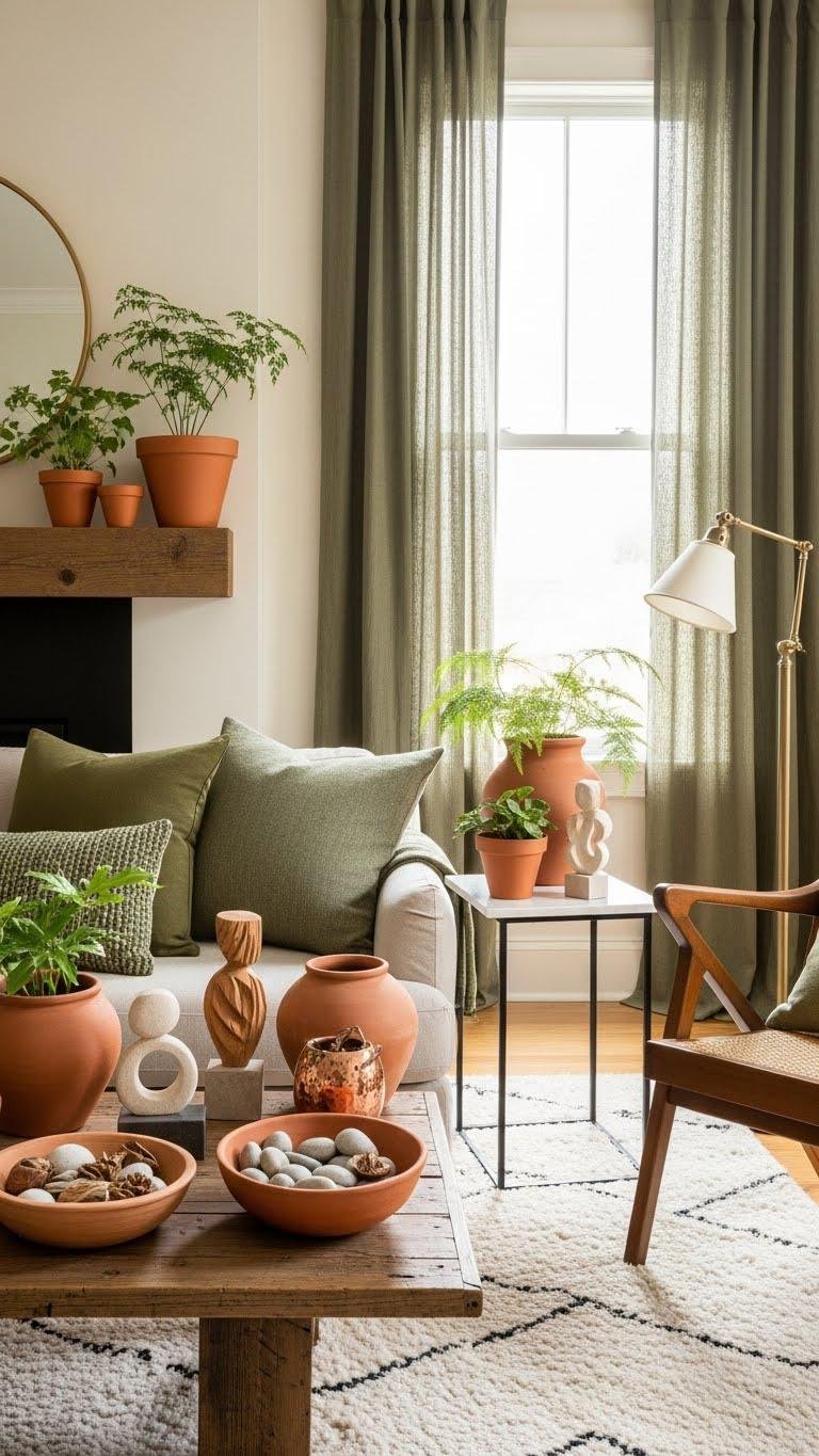 Lean into terracotta’s warm, grounded tones and pair them with moss green accents to create a balanced, nature-forward palette that feels current and calming. You’ll layer terracotta accents—pots, bowls, small sculptures—with moss green textiles like throw pillows and linen drapes. The combo feels earthy yet fresh, invites easy movement through rooms, and lets you mix vintage finds with modern pieces for a liberated, lived-in look.