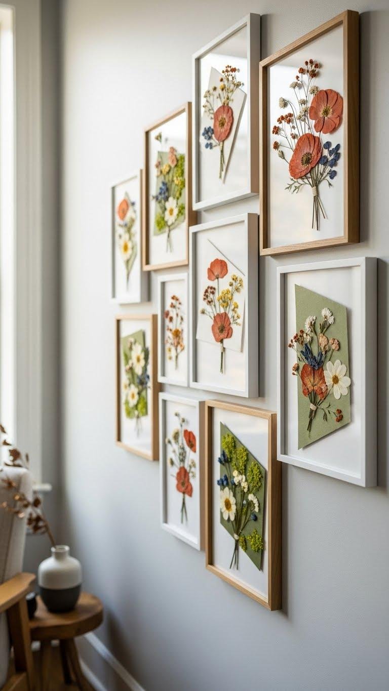 Pairing terracotta and moss green sets a warm, organic stage for pressed flower frames to shine. You’ll showcase pressed bouquets behind glass, letting light reveal texture and color.