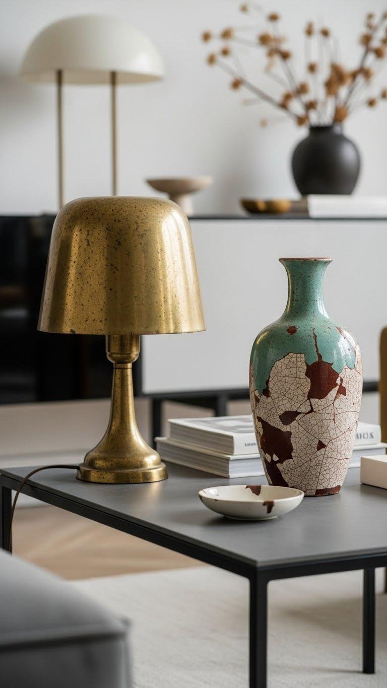 Hunt for a worn brass lamp or a chipped ceramic vase at flea markets, then set it beside a sleek, matte coffee table to let contrast do the talking.