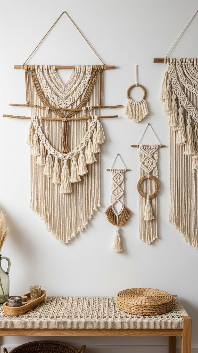 Once you’ve balanced patina against clean lines, introduce macramé wall art to soften the room and add handcrafted texture. You’ll pick pieces in natural jute or cream cotton, pairing minimalist knots with airy fringe. Hang at eye level above a low shelf or bench, mix a statement piece with smaller works, and let vintage tassels and organic shapes create a free, relaxed focal point.
