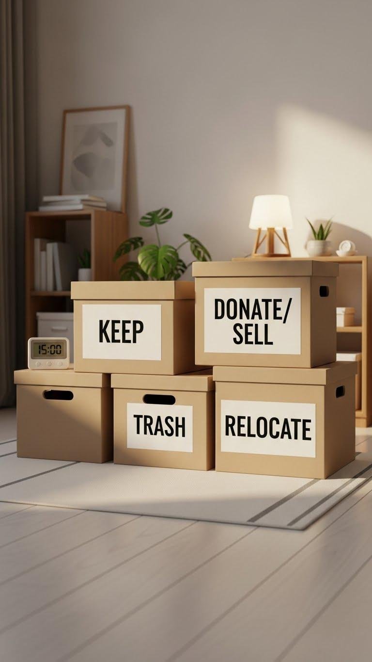 Clearing surfaces primes you to work room by room with a simple system: grab four boxes labeled Keep, Donate/Sell, Trash, and Relocate.