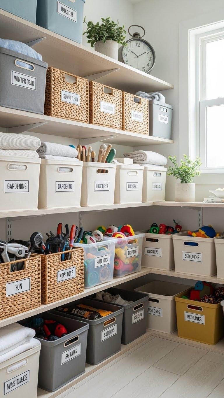 Use color coded bins to create calm visual order and assign seasonal labels for easy rotation.