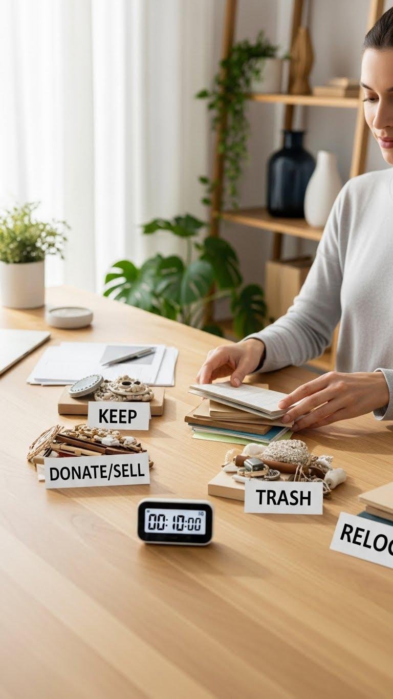 Set a timer for 10 minutes and tackle one visible surface or small zone, using quick decisions to keep, donate/sell, trash, or relocate; these focused bursts maintain order without overwhelming your day, build momentum, and make clutter management a simple, sustainable habit.
