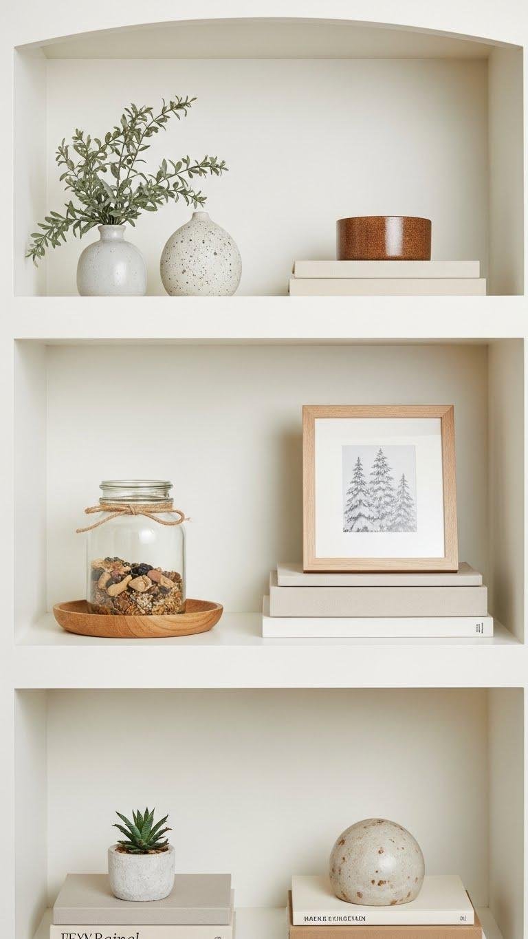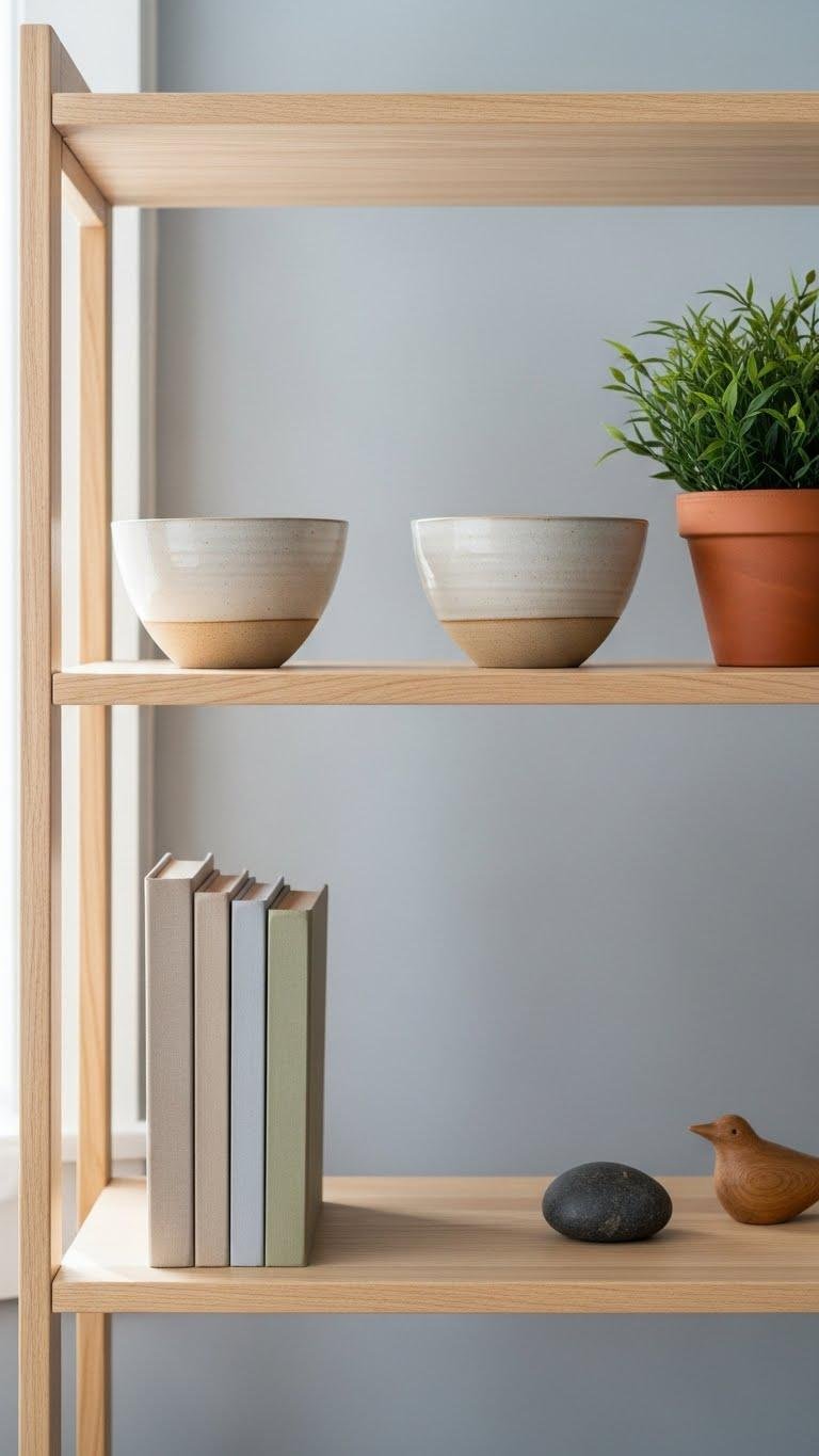 You’ll place only essentials and pieces that breathe — a pair of bowls, a plant, a neat stack of books. Use symmetry arrangements and color coordination to create calm, intentional vignettes. Keep negative space; resist filling every shelf so the room feels free and airy.