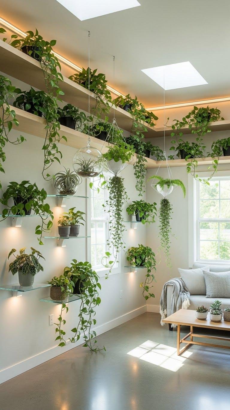 Because light and greenery work together to expand perception, introduce plants and layered lighting to make rooms feel airier and alive. You’ll place trailing plants on high shelves and use indirect lighting to wash walls softly, creating depth without clutter. Opt for pots that float or hang, keep surfaces clear, and let natural light pair with warm LEDs so spaces breathe and invite movement.