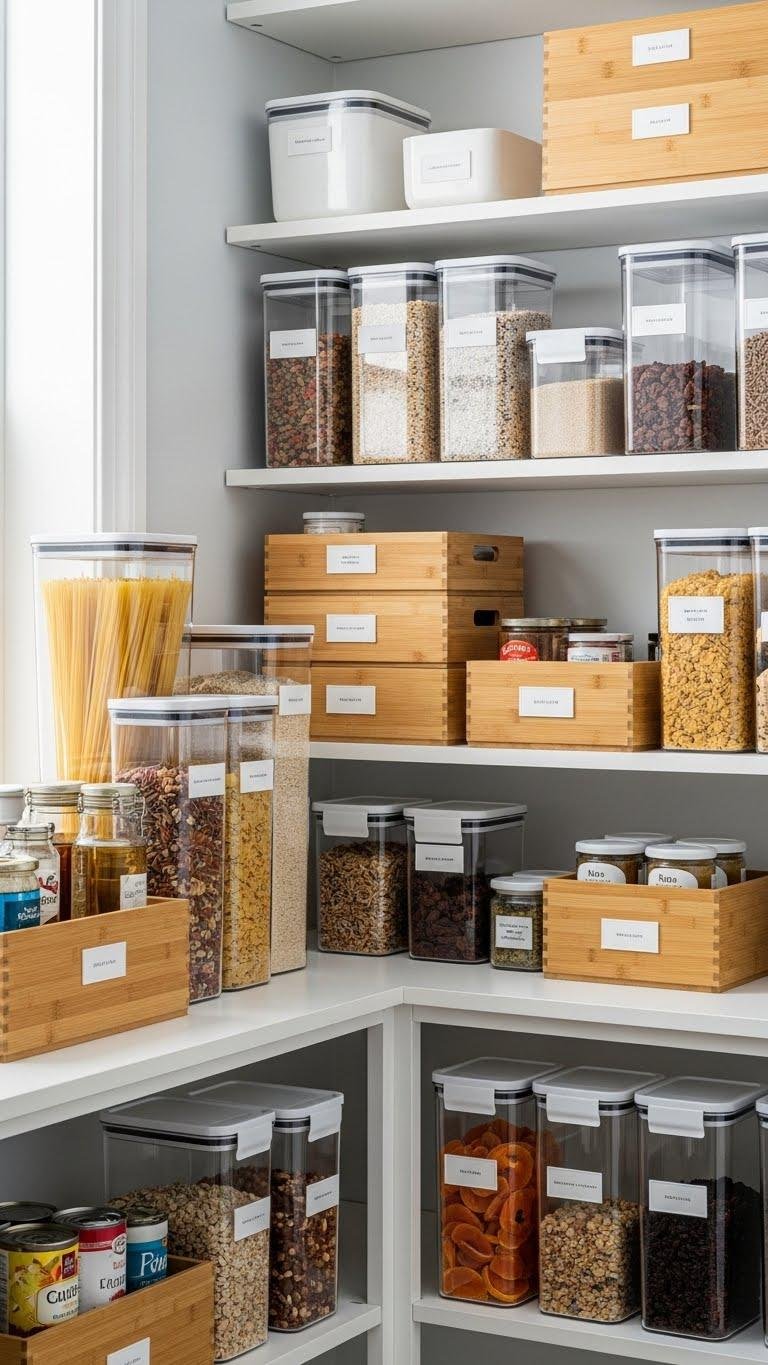 Choose neutral containers, clear labels, and a simple shelf layout to keep movement effortless and spaces airy.